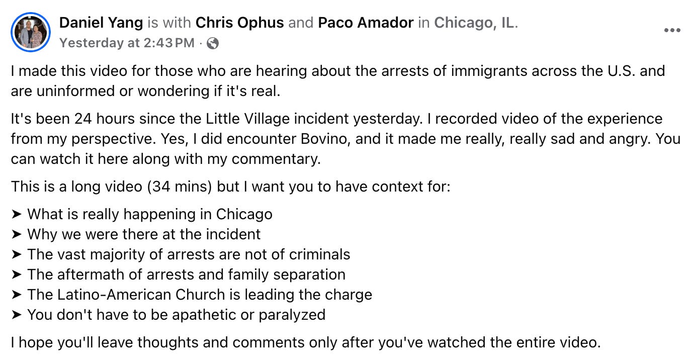 Daniel Yang shares about an unexpected encounter with Gregory Bovino in Little Village this past week. Continue to pray and support our pastors, churches, brothers, and sisters in Little Village and other vulnerable communities. Watch here