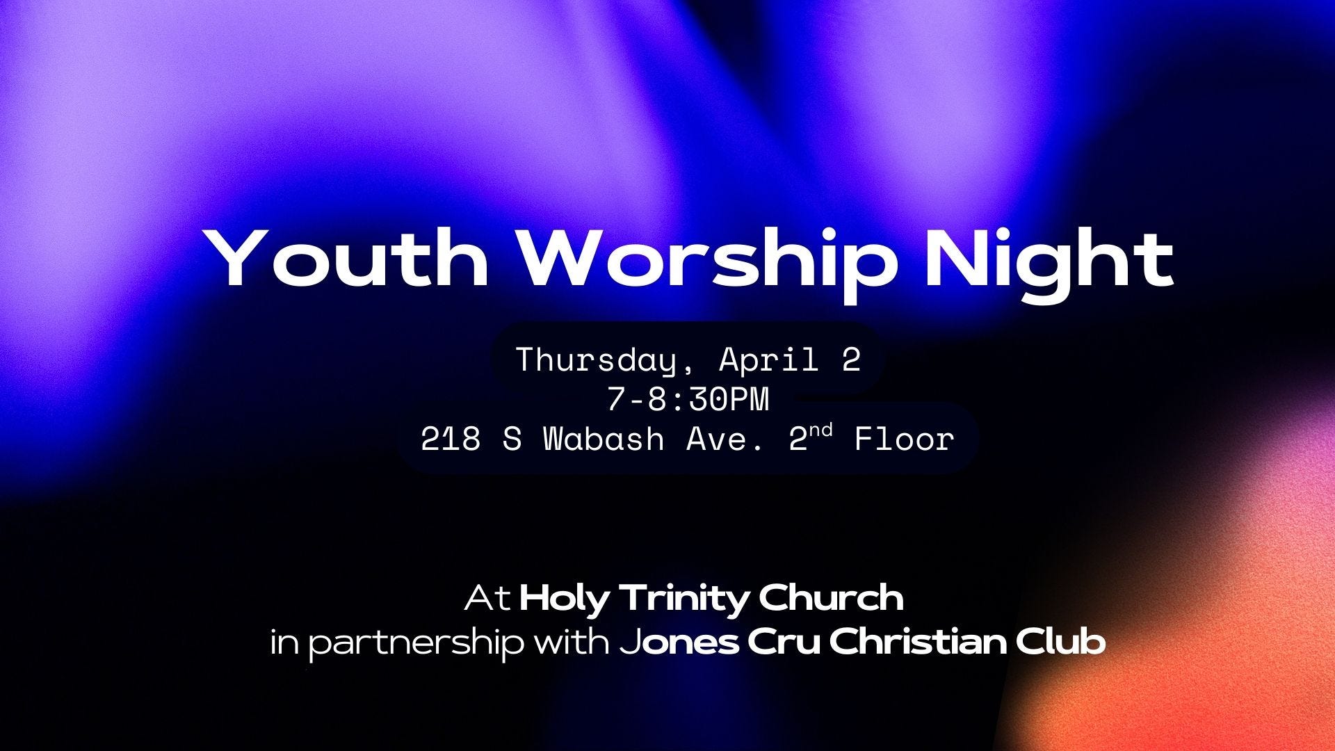 Students and youth leaders from across the city are invited to a special Youth Worship Night on Apr 2 from 7-8:30p at Holy Trinity Church (218 S Wabash Ave, 2nd Floor) in partnership with the Cru Christian Club from Jones College Prep. Middle school and high school students, along with youth ministry leaders, are encouraged to attend.
