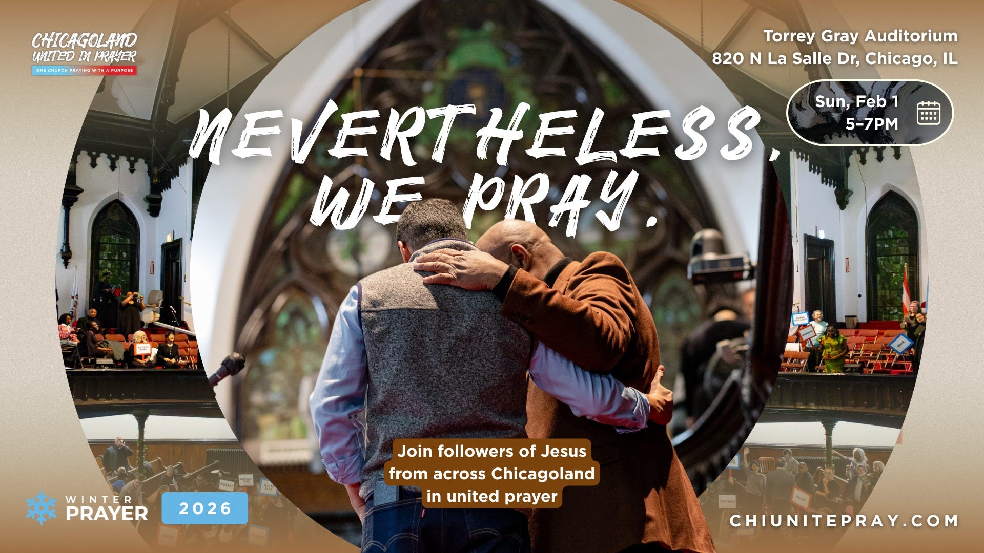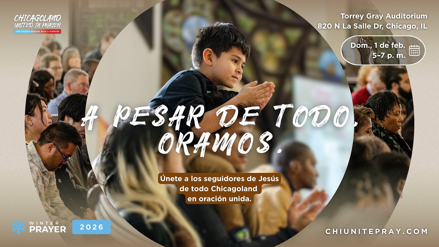 Has your church made plans to start the New Year? We’re partnering with Chicagoland United in Prayer to bring together churches for 21 days of prayer, Jan 12–Feb 1, culminating in a citywide gathering on Feb 1. We will be sharing daily devotional videos from local leaders sharing from the book of Nehemiah. Learn more about how to participate at join-tcp.org/21days.