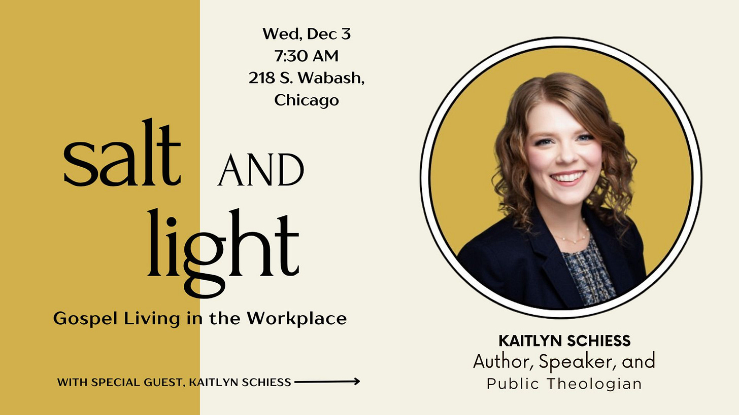 Join Faith & Work Chicago for their quarterly Salt & Light event on Dec 3 with guest speaker Kaitlyn Schiess. We look forward to thinking deeply about how to represent Christ with integrity, wisdom, and grace, even in a complex and polarized workplace. Info here.